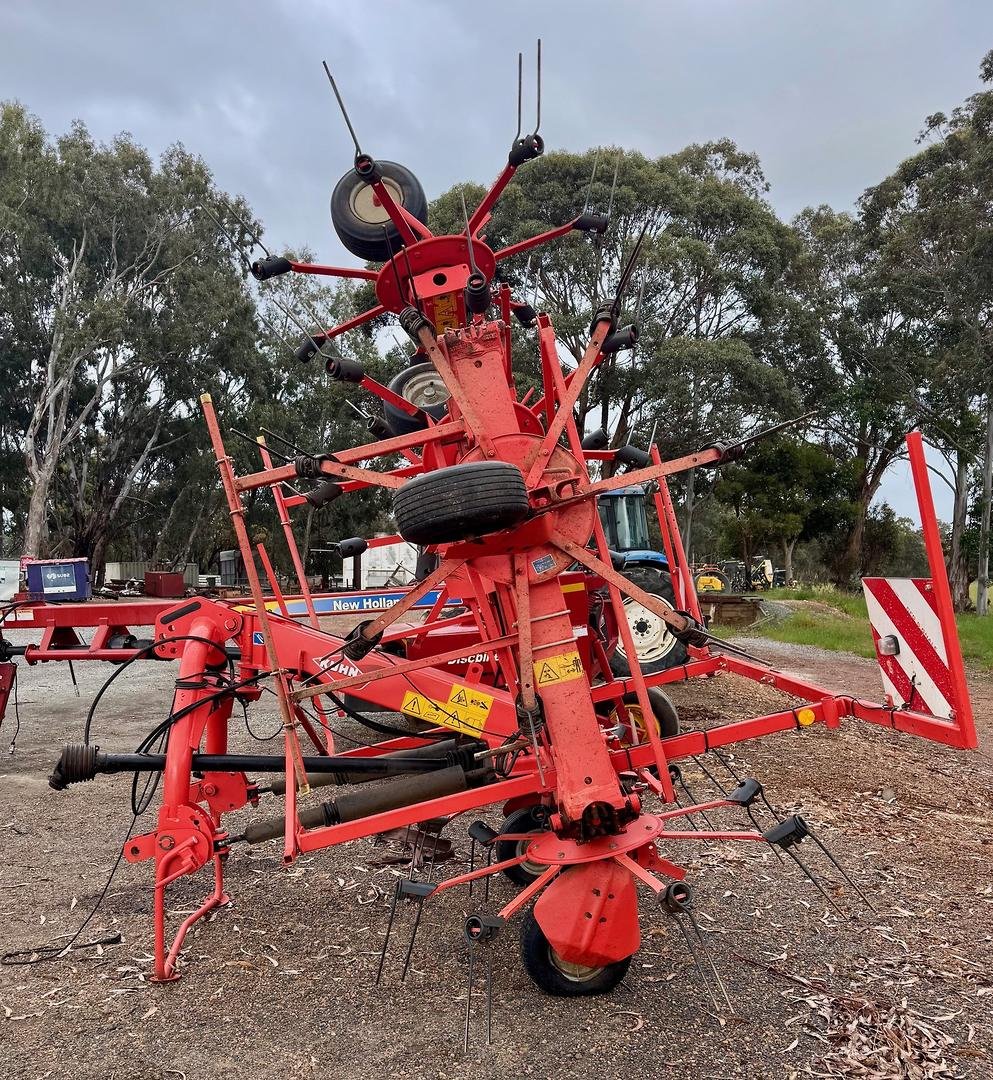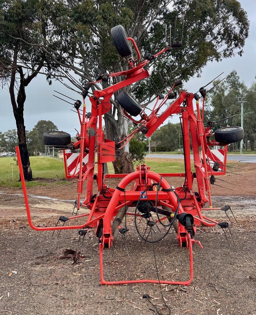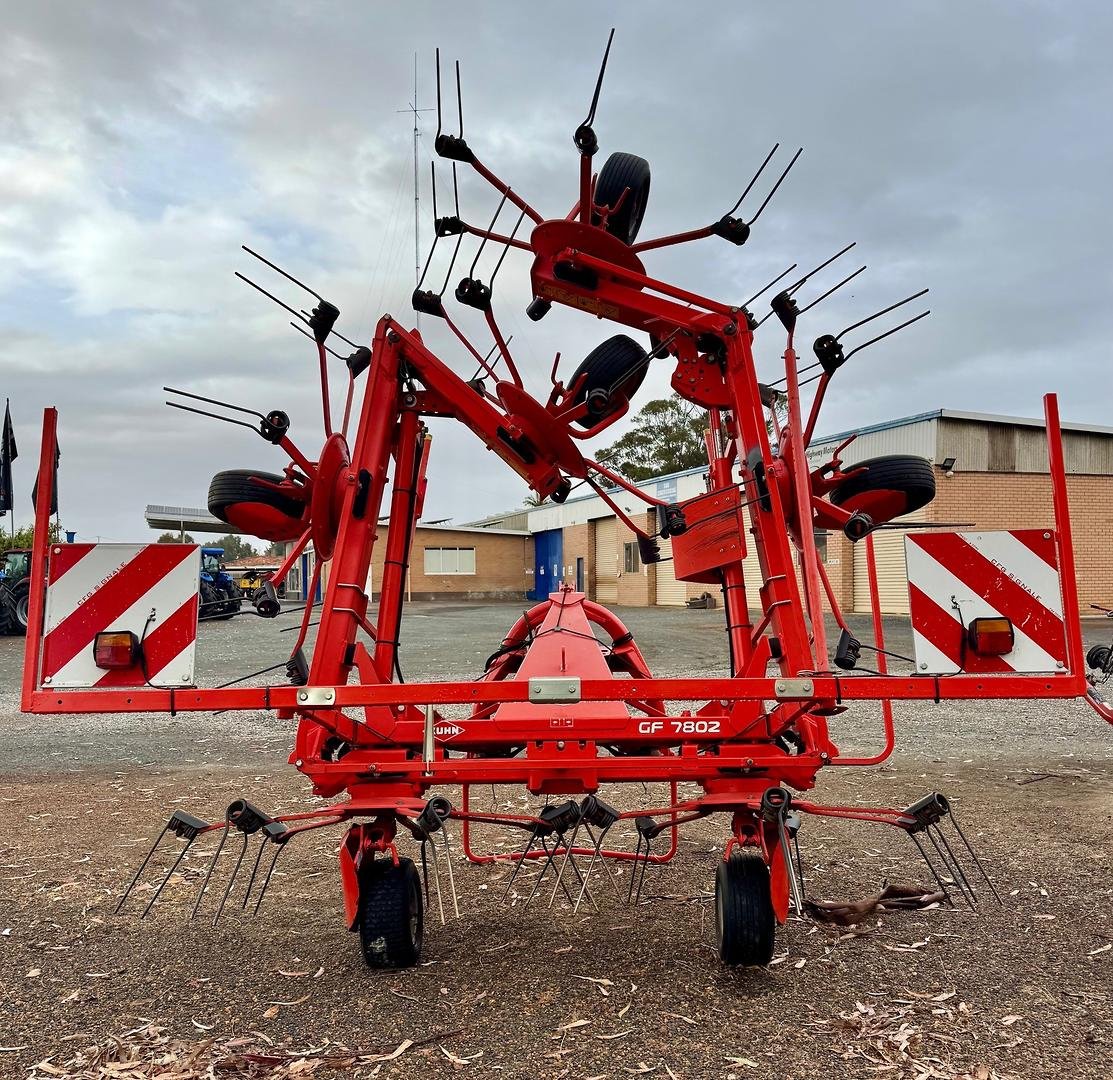 Used (MY2016) Kuhn GF7802 three-point linkage tedder - 7.80 meter working width, 2.99 meter transport width, 6 rotors, 7 tyne arms per rotor, wheel deflectors, 3 position pitch angle, multiple finger couplings rotor drive (no bearings), 16 x 6.50 - 8 tyres throughout the tedder, hydraulic vertical folding.