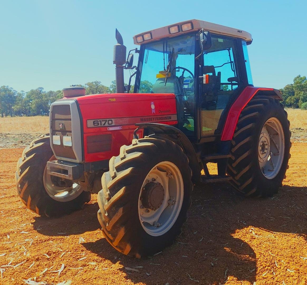 Massey Ferguson 6170 (FWD), 6-cylinder diesel engine rated @ 107hp, 32 speed four-speed power shift transmission, rear PTO speed of 540/100 rpm, with rear 3-point linkage.